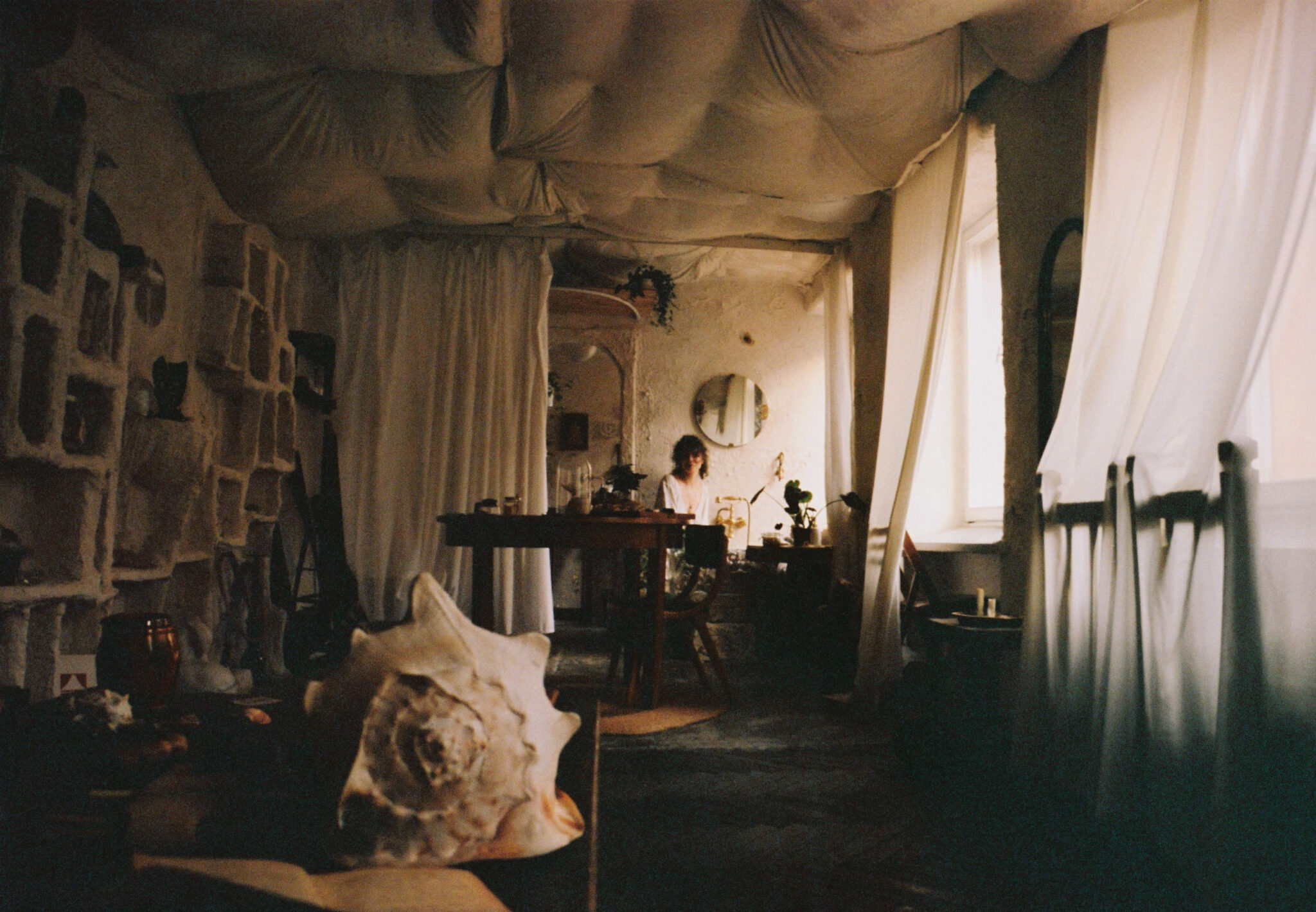 Świątynia ma sprzyjać połączeniu ze swoim „wyższym Ja”. Przy aranżacji zadbałam o to by każdy poczuł w sobie tą boską energię kreacji. Inspirowałam się skalnymi kościołami Kapadocji, ale dodałam również mojego surrealistycznego smaczku. Cały sufit jest wyścielony gipsową „puchatą kołderką” która dodaje otulenia i miękkości pracowni.