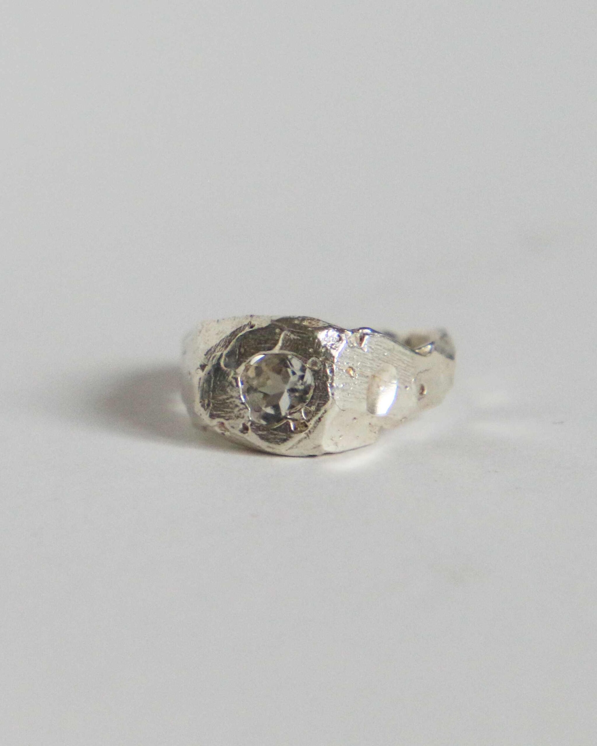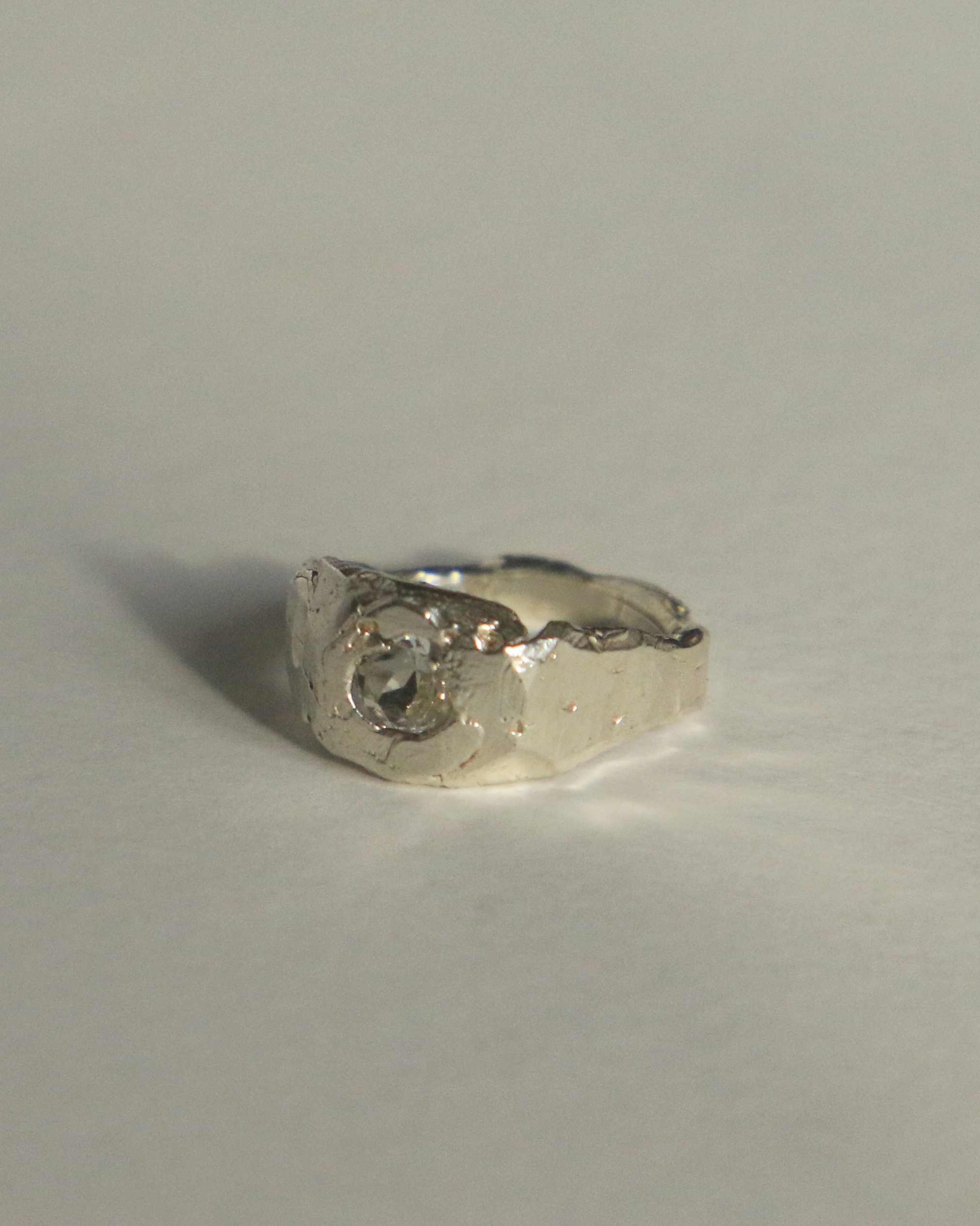 Pierścień zachowuje swoją surową, „poranioną” fakturę, bo proces oczyszczenia nie polega na wygładzeniu życiorysu, lecz na przebudzeniu w nim nowej jasności. Na popiele dawnych historii pojawia się delikatne tchnienie życia, a horyzont zaczyna drgać obietnicą światła.