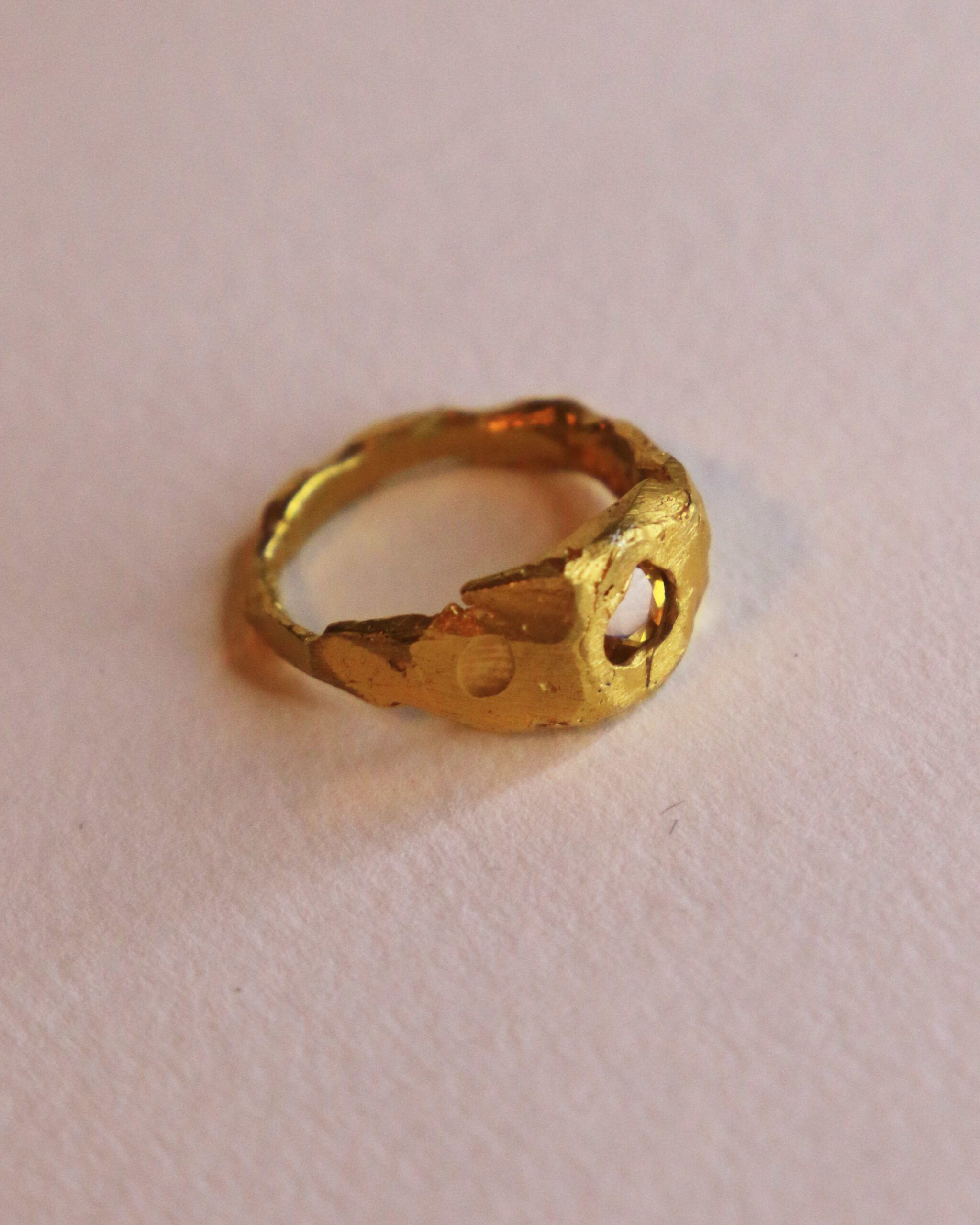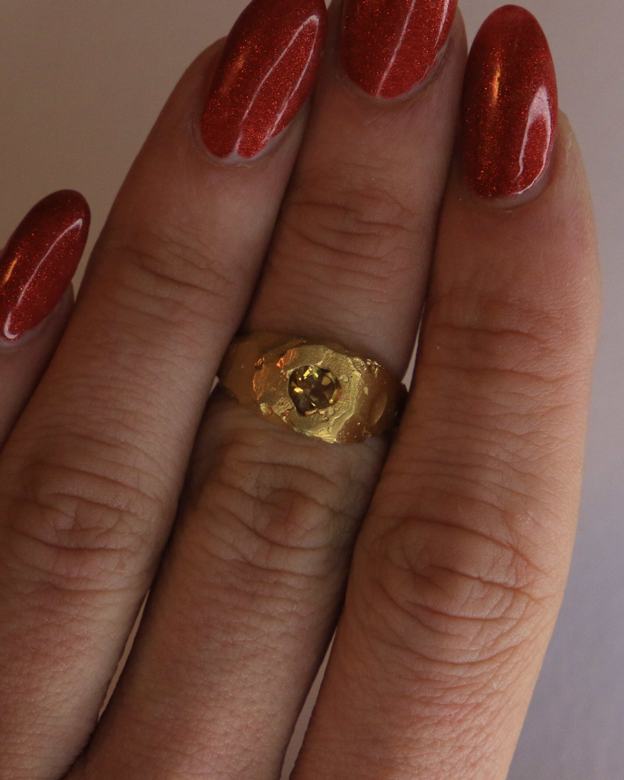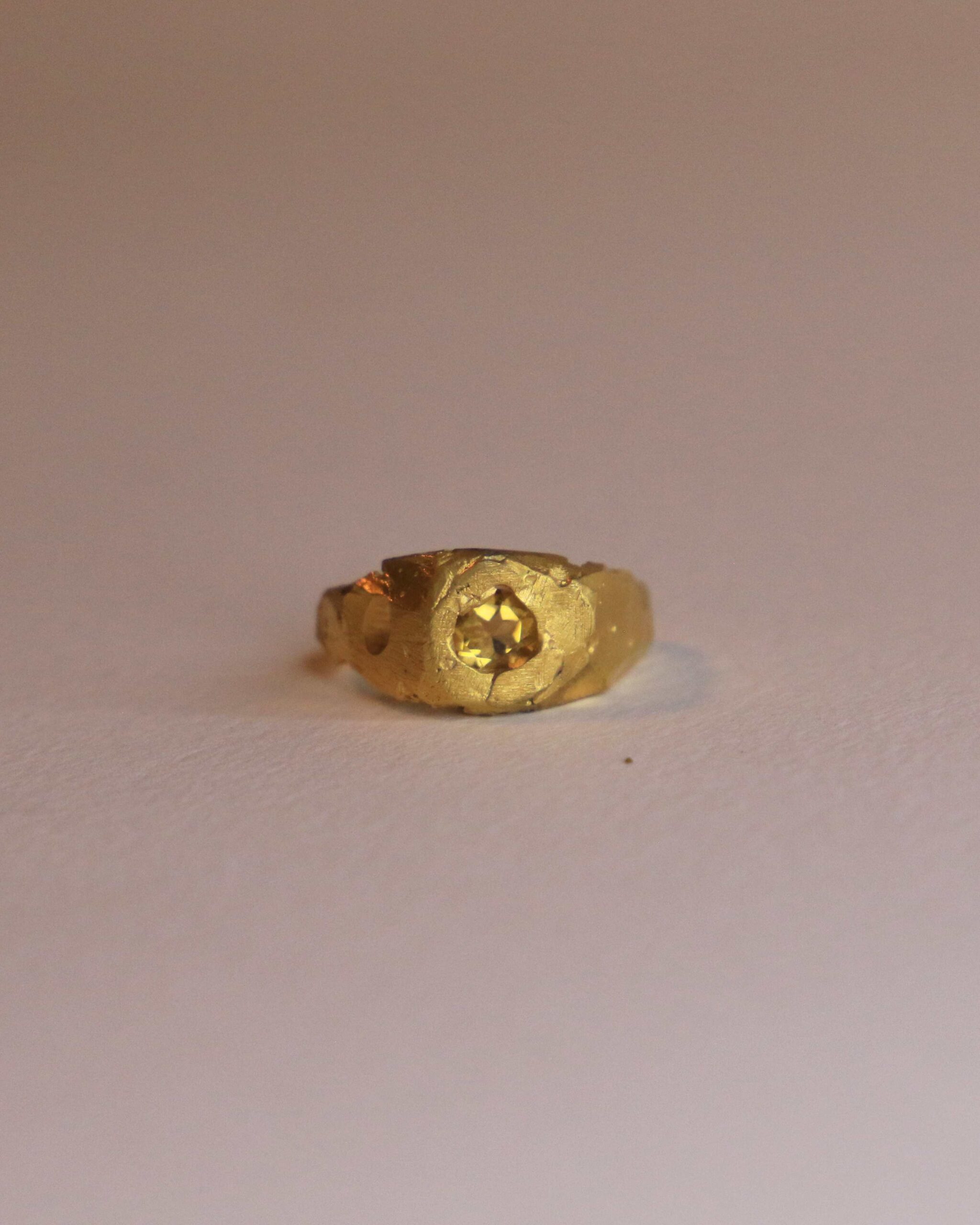 Pierścień zachowuje surową, „pokiereszowaną” formę — bo złoto rodzi się w pełni, a nie w doskonałości.