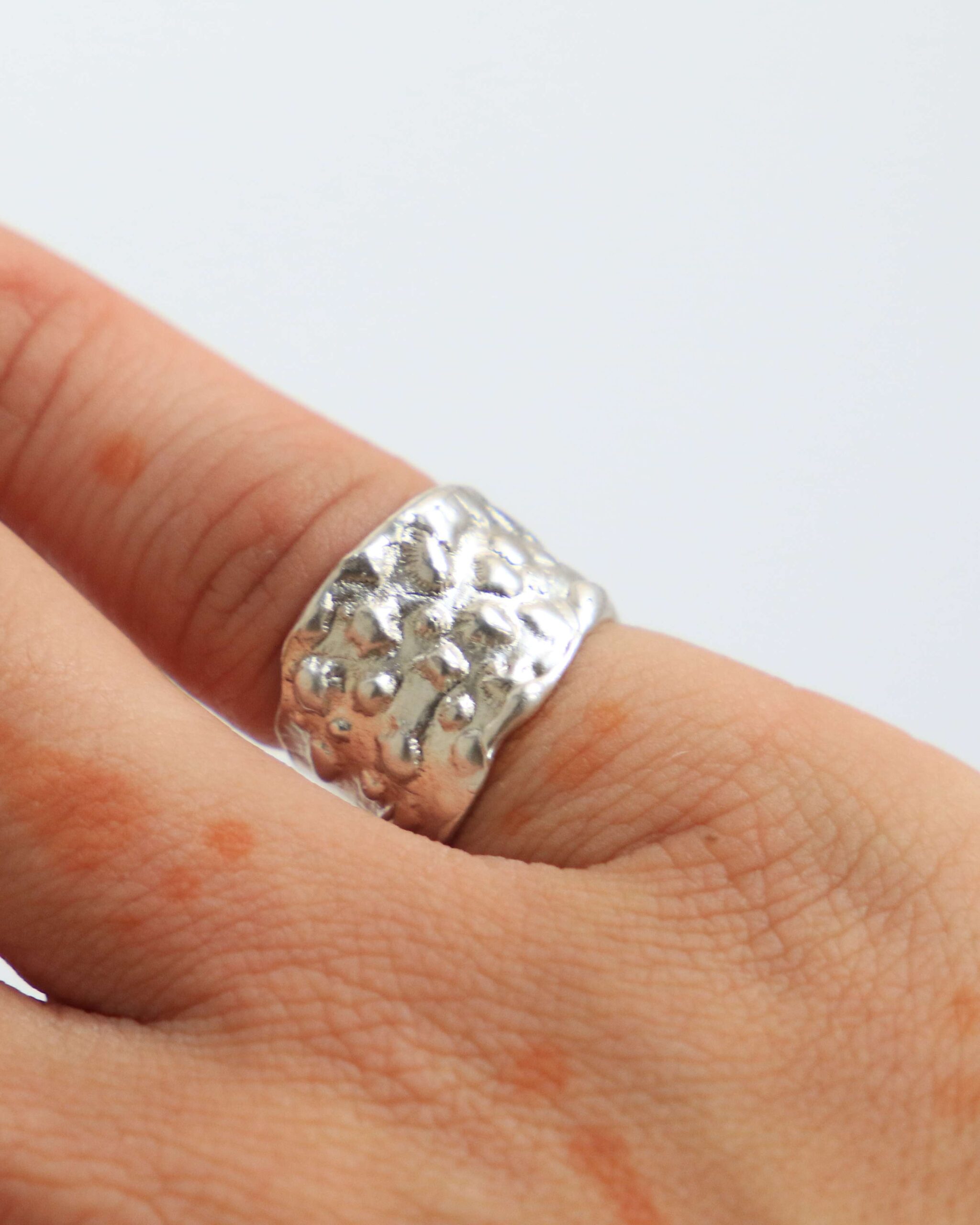 Jego powierzchnia przypomina zastygłą pianę fal rozbijających się o skały – lekką, a zarazem potężną. To pierścień o fakturze organicznej i dzikiej, jakby wyrzeźbiła go sama natura. Symbolizuje ulotność chwili, która jednocześnie ma w sobie ogromną siłę – tak jak piana morska, krucha, lecz nieodłączna od oceanu.