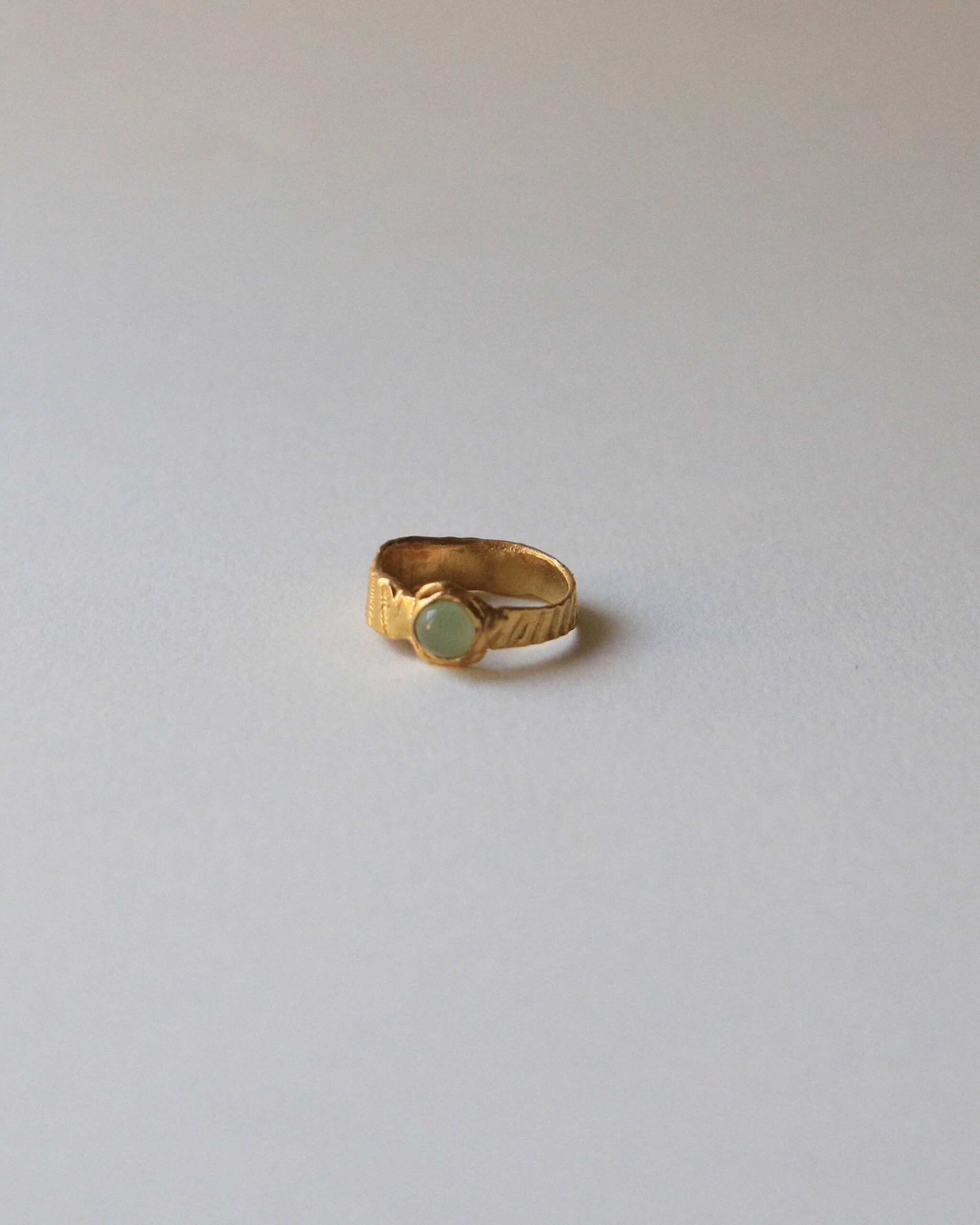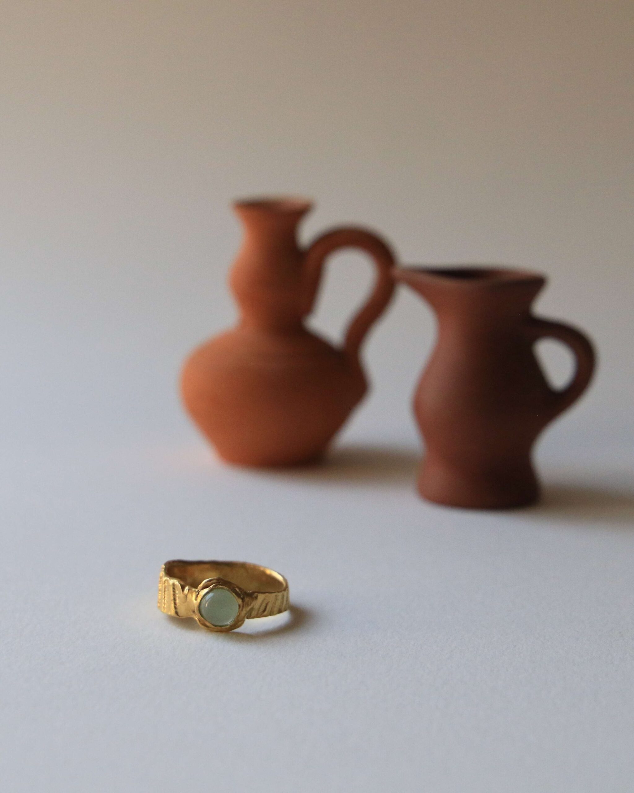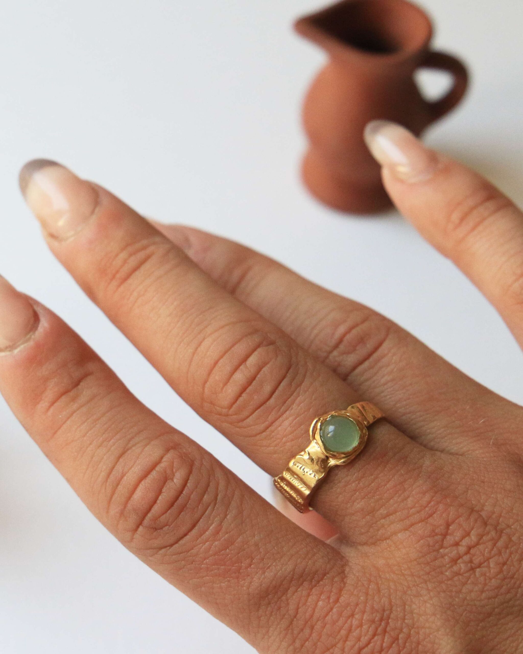 Każda muszla opowiada swoją historię – o falach, które ją kołysały i o czasie, który nadał jej kształt. Ten pierścień jest właśnie taką opowieścią: odciśnięty wzór muszli w złoconym srebrze i chryzopraz, kamień odrodzenia i świeżości. To jak kropla morskiej zieleni, która niesie spokój i przypomina, że zawsze możesz zacząć od nowa. Nosząc go, nosisz w sobie oceaniczną harmonię i cichą siłę natury.