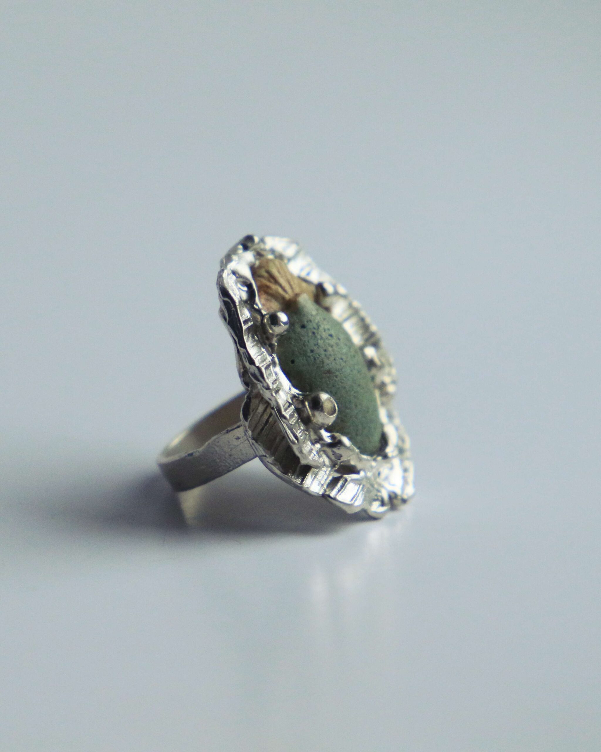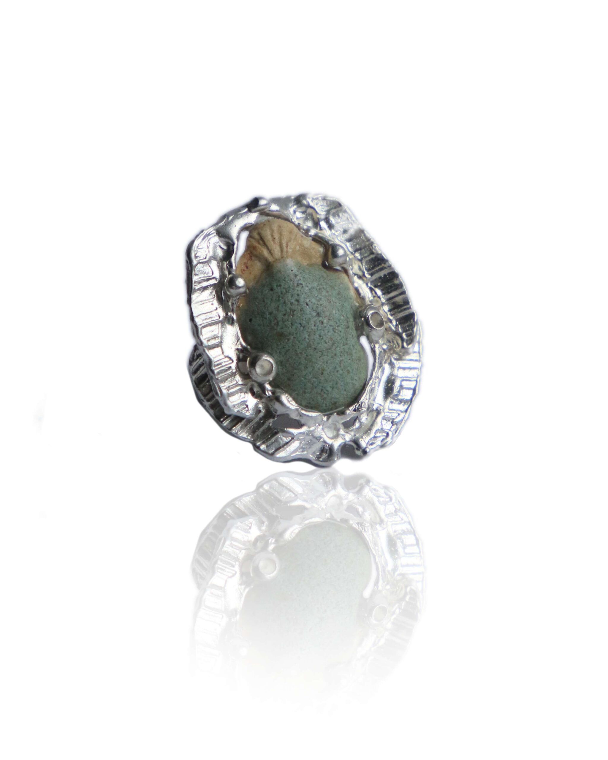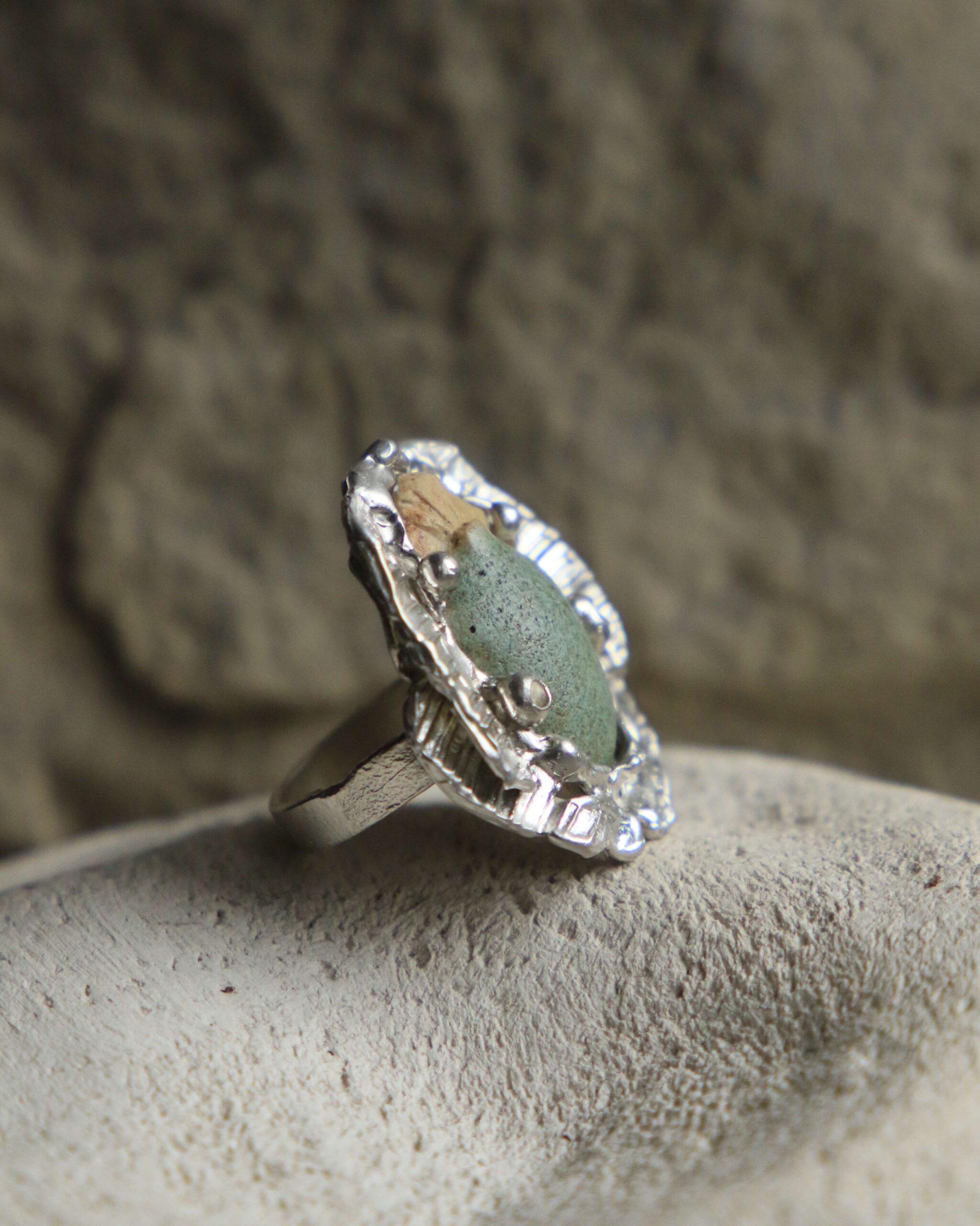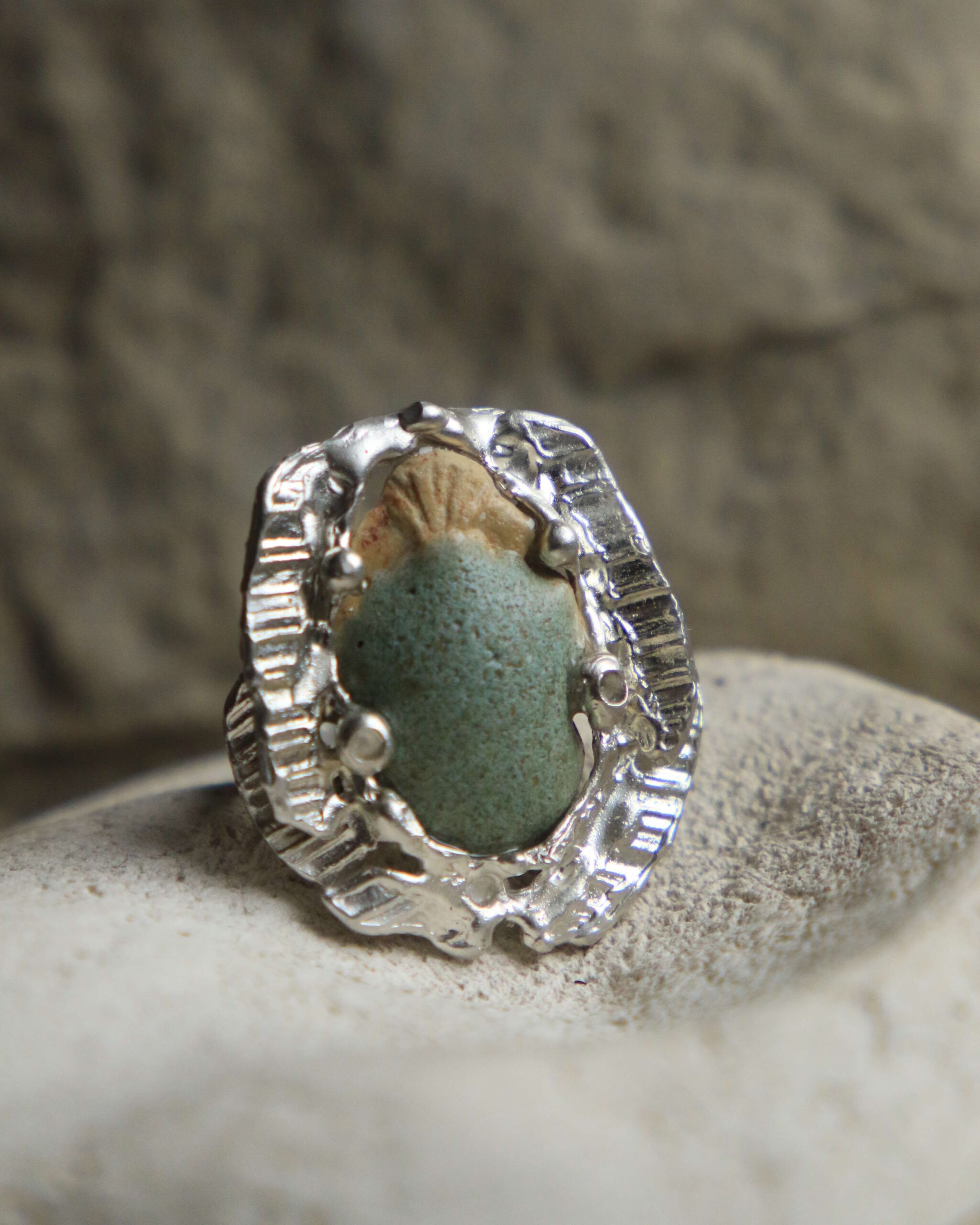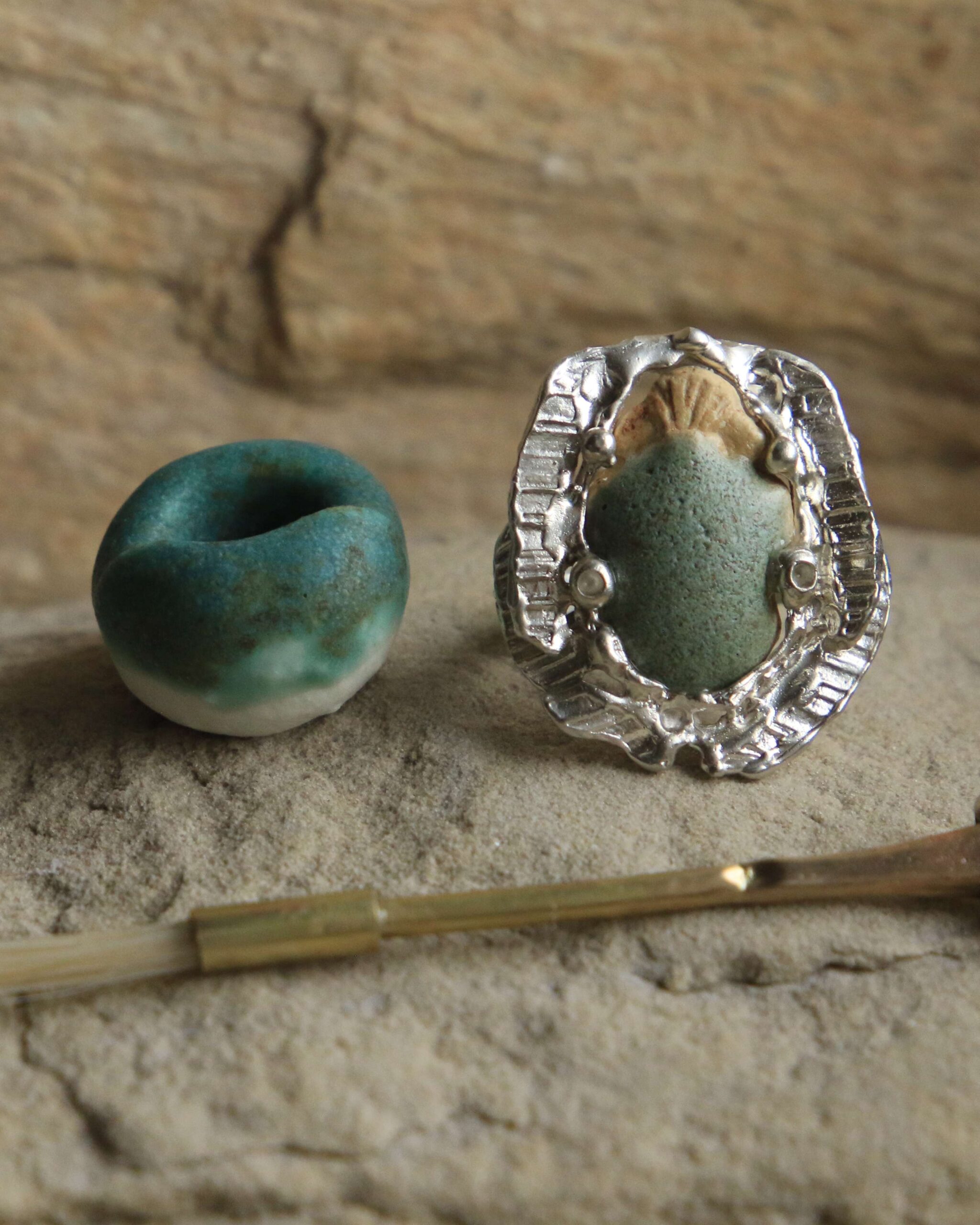 Do każdego pierścienia dołączona jest ręcznie formowana i szkliwiona bryłka ceramiczna — osobista „leżanka” dla skarabeusza.