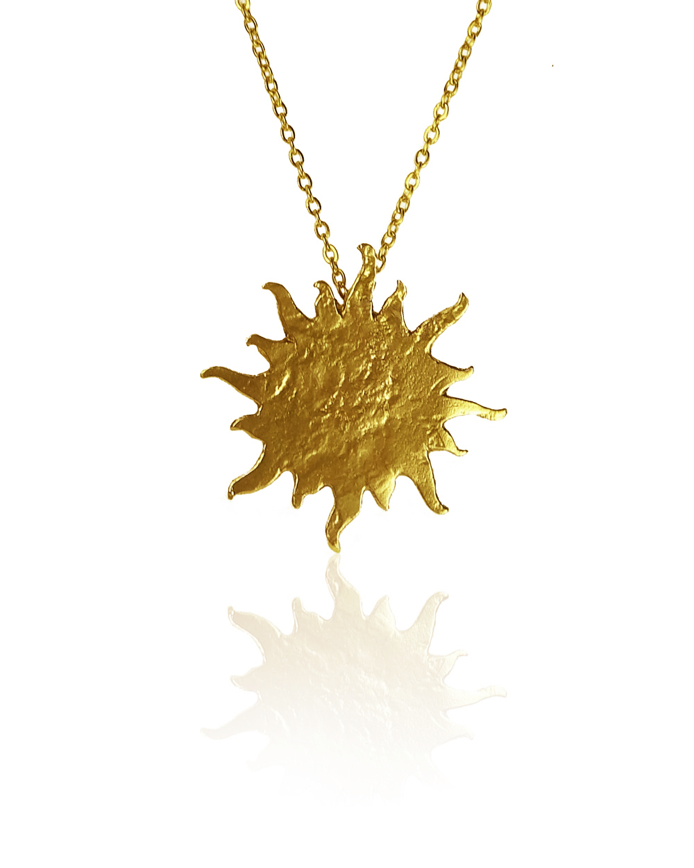 Przywieszka Solar jest wykonana z mosiądzu, czyli połączenia cynku i miedzi. Pozyskany złoty odcień sprawia, że zawieszka staje się eleganckim, dostarczającym uroku dodatkiem. Łańcuszek to stal chirurgiczna w kolorze złotym o długości 55cm.